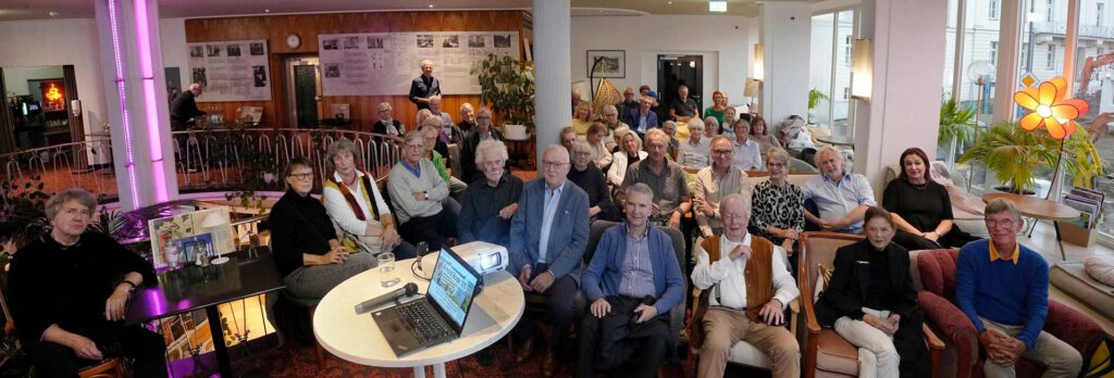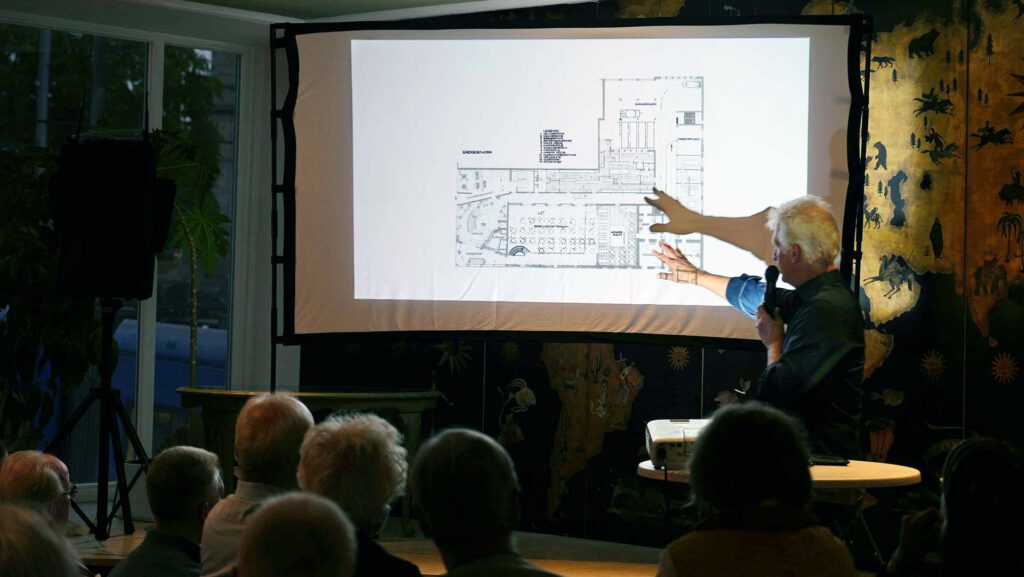 Im ersten Teil des Abends berichtete unser Mitglied und Architekt Matthias Tunnemann unter dem Titel „Vom Stadtpalais zum Hotel Hessenland“ über die wechselvolle Bau- und Nutzungsgeschichte des Hauses und zeigte dabei eindrucksvolle historische Fotos. Der für seine Hotelbauten in ganz Deutschland bekannte Bode-Bruder Paul war der Architekt des Hotels, das damals das erste Haus am Ort war. Die drei Brüder Paul, Arnold und Theo Bode planten auch die elegante Inneneinrichtung des Hotels bis hin zur Gestaltung des Nachtkabaretts „Die Perle“. Besondere Glanzstücke waren der Seitenflügel zur Friedrichstraße mit dem Caféhaussaal und die offene Terrasse im Dachgeschoss (1955) mit Liegestühlen. Das Hotel verfügte über außerordentlich große Zimmer und Bäder. Ein historisches Foto des berühmten „Zimmers 5“ veranschaulichte dies. Abschließend berichtete Matthias Tunnemann über den seit Langem geplanten Umbau des Hotels, der zusammen mit dem Hugenottenhaus erfolgen soll. Das Projekt soll 2027/28 fertiggestellt sein.