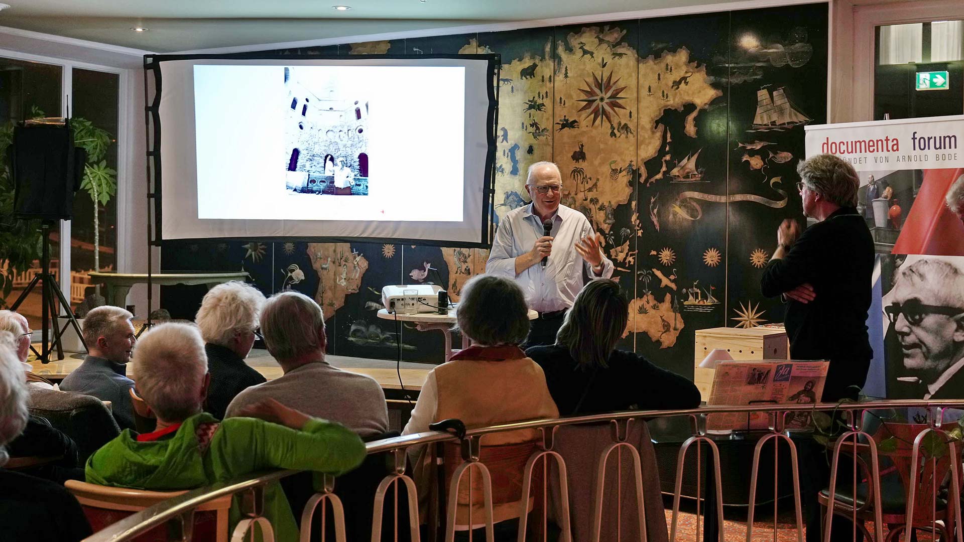 Anschließend hat unser Mitglied und profunde documenta-Kenner Dr. Harald Kimpel zum Thema „Local Friends of documenta“, Gründe und Begründungen für Arnold Bodes Ideenrettungsgesellschaft vorgetragen. Kimpel berichtete mit vielen interessanten Details und Wortwitz, dass Bode nach der documenta 1968, ab 1969 bereits seinen Freundeskreis um sich scharte, mit dem er weiteren Einfluss auf die documenta nehmen wollte. Bode stellte eine große Vorplanung mit Einbeziehung der Stadt und der Orangerie seinem Freundeskreis vor und verteilte Aufgaben, wie er gedachte den Plan durchzusetzen. Zur documenta 1972 wurde mit Harald Szeemann ein neuer künstlerischer Leiter bestellt, den Bode selbst mit ausgewählt hatte. Bodes Einfluss jedoch schwand immer mehr, obwohl er sich weiter sehr stark engagierte und Projekte wie documenta-urbana und das Oktogon-Projekt am Herkules plante.